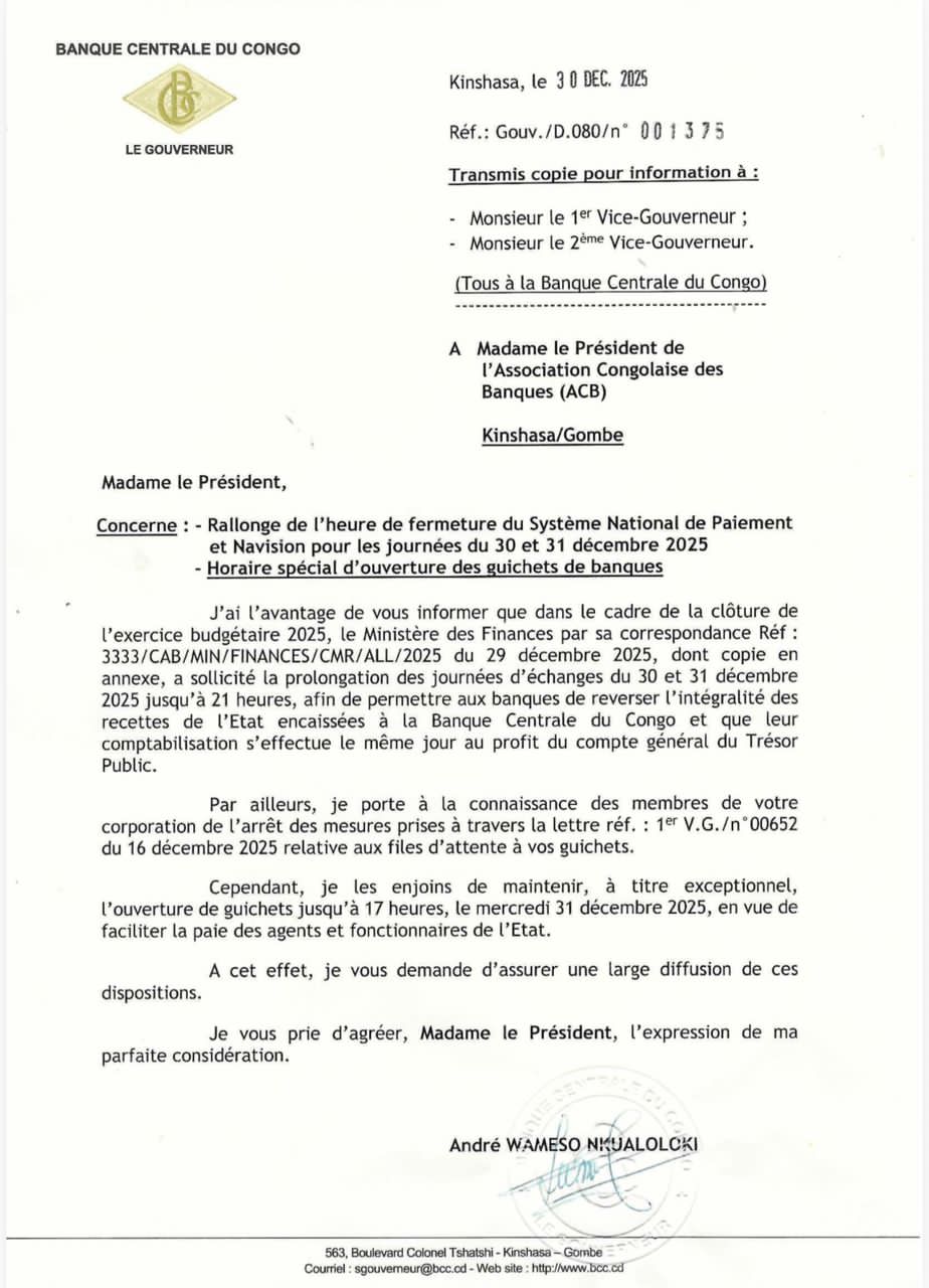 Dans le cadre de la clôture de l’exercice budgétaire 2025, la Banque Centrale du Congo informe, par cette correspondance adressée à l’Association Congolaise des Banques (ACB), d’une prolongation exceptionnelle de l’heure de fermeture du Système National de Paiement et Navision pour les journées du 30 et 31 décembre 2025. Cette mesure vise à permettre aux banques de reverser l’intégralité des recettes de l’État encaissées à la Banque Centrale du Congo, afin de garantir la comptabilisation des fonds le même jour au profit du Trésor Public. Un horaire spécial est également mis en place pour l’ouverture des guichets des banques, jusqu’à 17 heures le mercredi 31 décembre 2025.